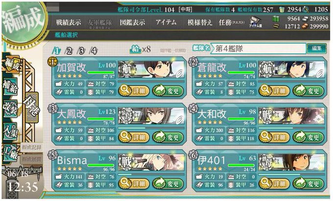大型艦3人の改造完了。4/19に大鳳大和ビス子同時に入手したから3人同時育成で弾薬減りやすかった。大和ホテル(布団欠かせん)wも実現したし明日からの春イベの為に資材溜める。然し火力すげーな金剛型と天地の差がある