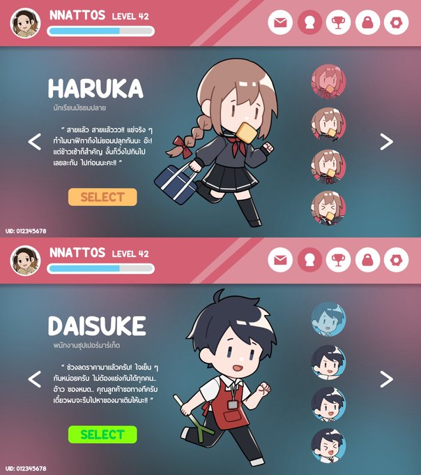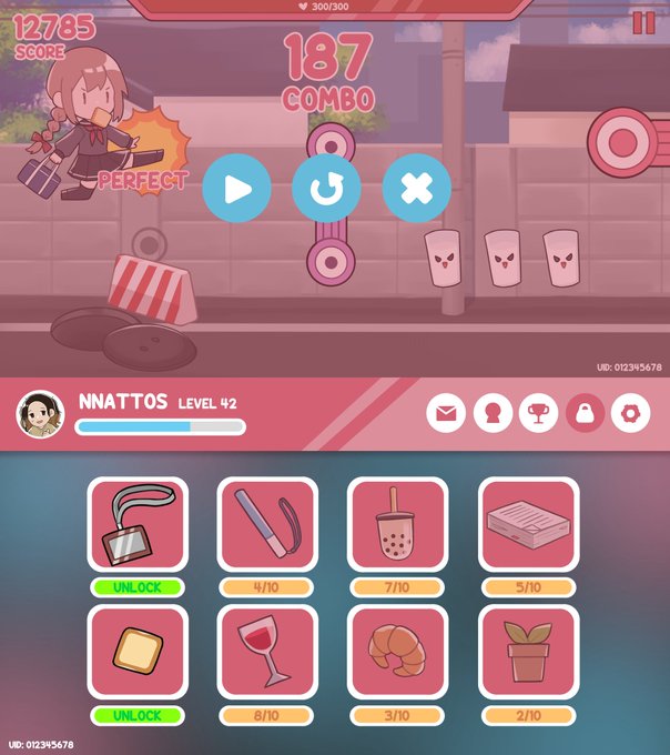 เป็นระบบเล่นจบเพลงสะสมไอเทมปลดล็อกตัวะครถัดไปเรื่อยๆ ไอเทมแต่ละอย่างจะบ่งบอกว่าจะเป็นตัวละครแบบไหน เช่น 🍷=บาร์เทนเดอร์ 🥐=พนักงานเบเกอรี่ คือคิดไว้เยอะแต่วาดไม่ไหวเดี๋ยวจะไม่มีส่งเอานะ 555555 นี่ชอบคิดบทพูดของตัวละครมาก ตอนคิดคือสนุกแบบเอาฮาให้สุด 1 ตัวละครมี 5 แอคชั่นด้วยนะ