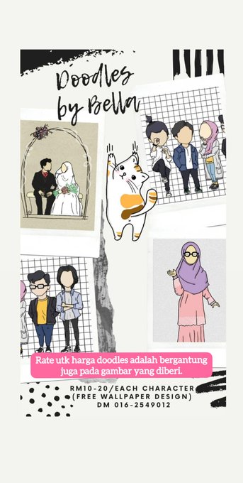 Aku buat doodles sebenarnya. Takdela bisnes seriius2 pun. Haha tapi untuk tabung sendiri/kahwin ehek! 😄 Doodles ni softcopy je ye ats sbb2 tertentu. Aku mampu buat camni je🙏 Limit character dlm 1 frame 2org shj. Nak byk2 tu ermm leh dm dulu kot tgok camne🤔