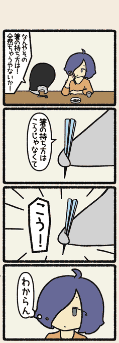 正しい持ち方ってどこで教わったっけ・・🥢 #4コマ #漫画が読めるハッシュタグ #ゆるいイラスト #リーゼントペンギンの4コマおマンガ