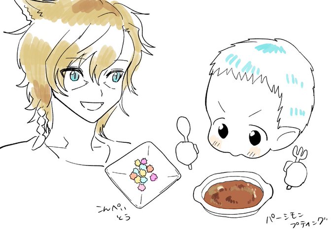 お菓子もらって嬉しいララノラ ( @ff14Lex00 さんのキャラお借りしてます)