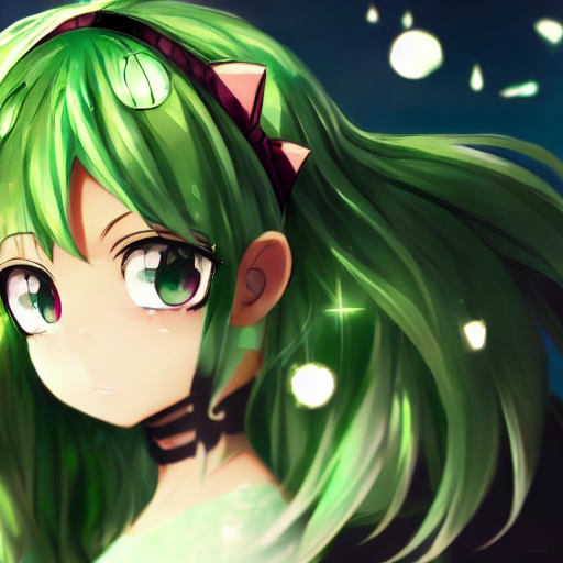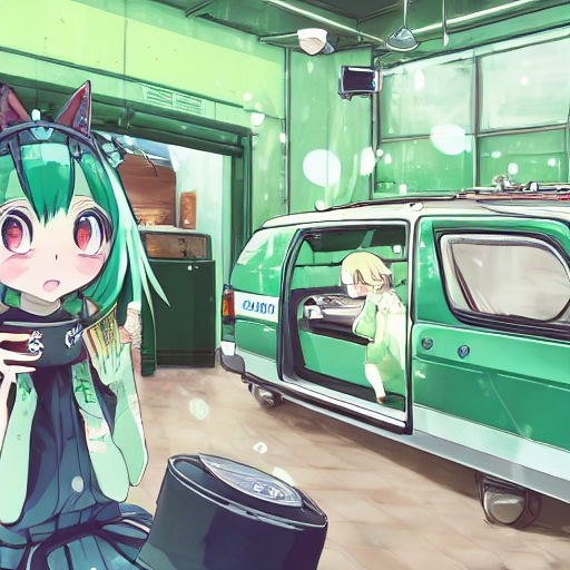 a green hair girl with cat ear, modern anime style, highly detailed, kawaii, concept art, 4k, wallpaperで1つ目のカンマの後に1枚目は何も加えず、2枚目はアニメーター名、3枚目は制作会社、4枚目は作品名を呪文に加えてみた結果。