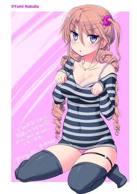 左側のイラストは2巻のメロンブックスさん限定掛け替えブックカバー用の特典イラストです。右側が正式なカバーイラストですが、特典のほうは上がブラウスからセーターに変更され、露出が大きくなっています😍
