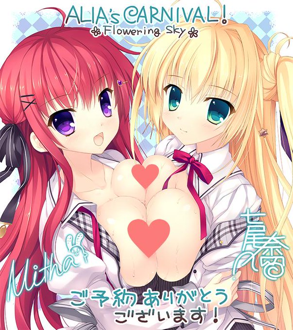 『ALIA's CARNIVAL! フラワリングスカイ』は本日より予約開始です! 早期予約すると「明日葉と月詠のおっぱいWぷるるん色紙」がもらえるキャンペーンも実施中! #nanawind http://t.co/b9en9WPWNL