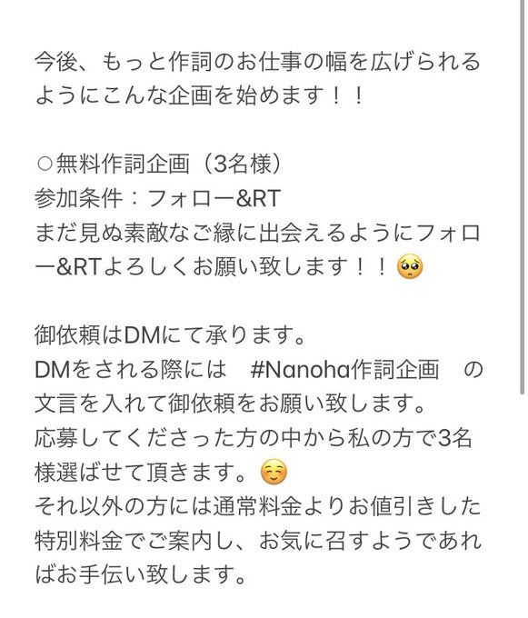 #Nanoha作詞企画 の文言を入れて御依頼をお願い致します。応募してくださった中から私の方で3名様選ばせて頂きそれ以外の方には通常料金でご案内致します😭😭