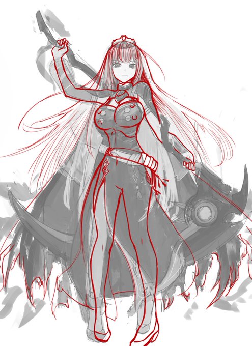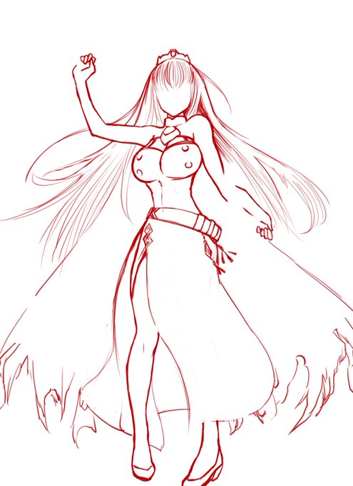 @Teeeeeeras 参考程度に見てもらえれば… 衣装のデザインに惑わされて腰の位置があやふやになってしまってるのが、足の位置が決まらない原因かなと 首と肩を基準に腰の位置を決め、女性らしい柔らかさを引き立たせるのと元からの安定感ある構図を極力尊重しながら線を引きました