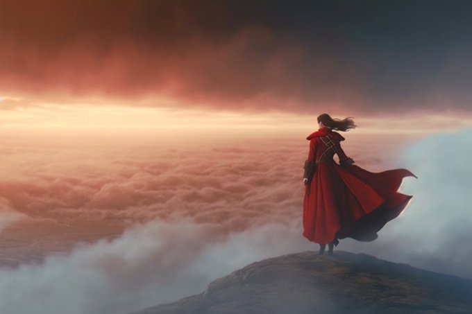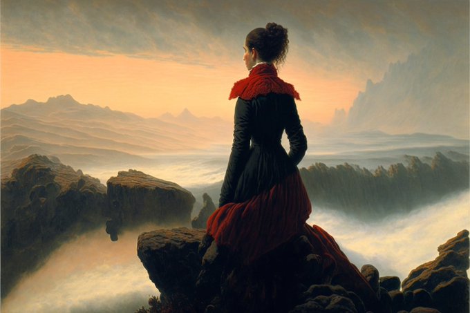 Here for example the Wanderer over the fog by Caspar David Friedrich but featuring a woman.