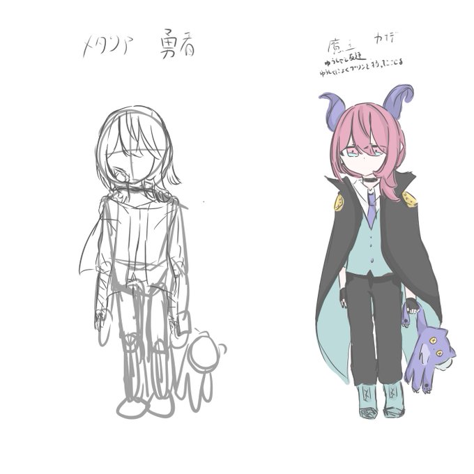 ナオ詐欺師 魔王カナデ (キャラデザまだ)勇者メタリア 死後の国の配達員 メターシャ