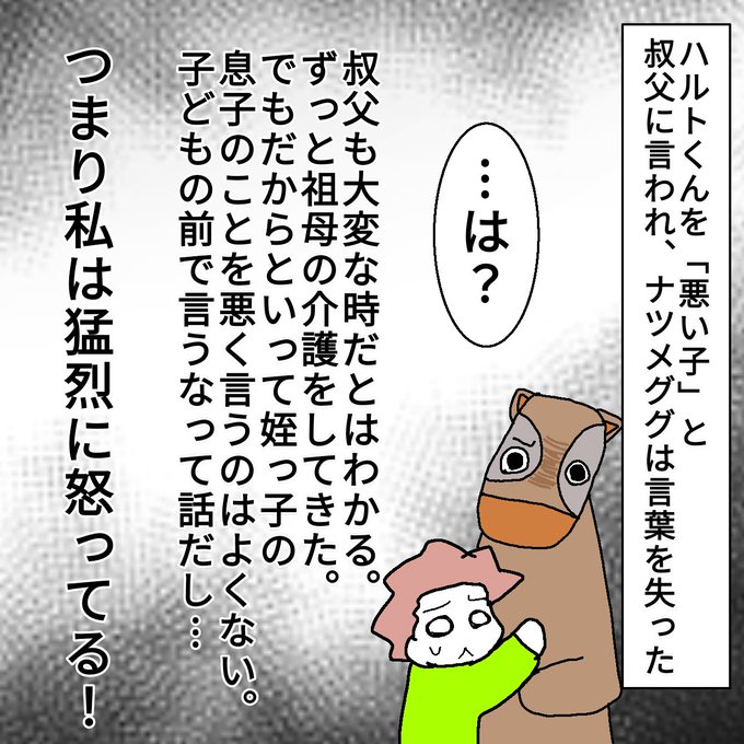 発達障害の甥っ子と長男ケイの衝突⑧ 祖母が余命宣告を受け慌てて叔父の家に来ました。久しぶりに会った叔父にモヤっとしてたら、更にモヤる一言😰 ···はぁ?😡 #男の子ママ #3歳 #4歳 #育児 #育児絵日記 #育児漫画 #ワーママ #発達障害 #子どもの喧嘩