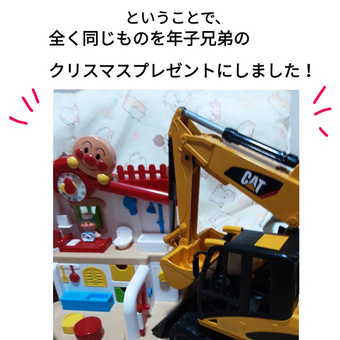 年子兄弟に、アンパンマンはじめてハウスと、ショベルカーをあげました。同じものを2つ買うなんて勿体ないように思えましたが、争いが回避できてるだけでかなり助かる(゜-゜) #クリスマスプレゼント #育児 #育児絵日記 #育児漫画 #1歳2ヶ月 #2歳9ヶ月 #年子兄弟 #男の子ママ