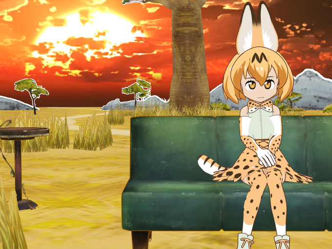 なんか自分で作ってしまった。#フレンズにしてほしい事を呟くとその画像が貼られる 一人椅子に座って、少し先を眺めて物思いにふけっているサーバルちゃん