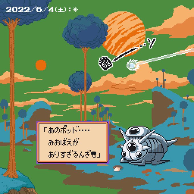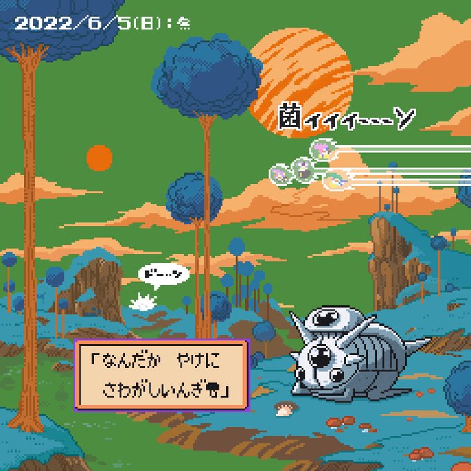 スラマッパギんぎ~✨🍄 今日もすこやか天気はおひさま☀️ おにぎりのにおいにさそわれて おひまなマンドラゴラが やってきたんぎ🍄 今日もおひまな一日に なりますようにんぎ~( ・᷄3・᷅ )ノ✨🍄 #ドット絵 #pixelart #きのこ