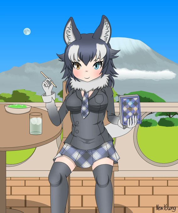Gray wolf-chan's holiday in Africa and the mountain behind her is "Kilimanjaro Volcano"