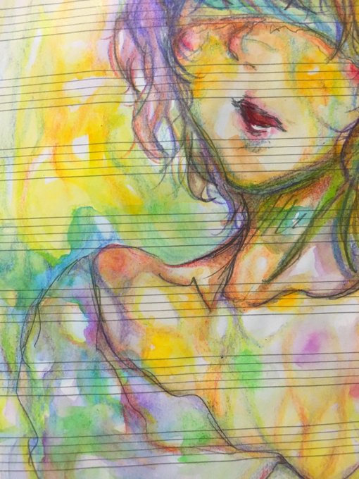 『産声』 #水彩画 #虹色鉛筆 #五線譜
