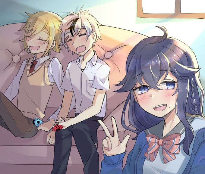 寝てしまった男子二人と珍しく起きてる霞ちゃん おなえ大好きです #出雲墨絵 #絵画コウ #漆黒の水鏡