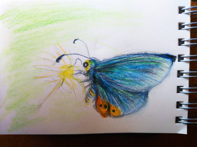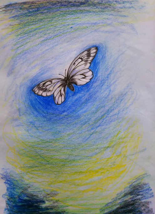空を見上げると ウスバシロチョウが ふわーっと飛んでいる 色鉛筆画 #ウスバシロチョウ #蝶 #色鉛筆画 #イラスト #イラストレーション #落書き #イラスト好きさんと繋がりたい