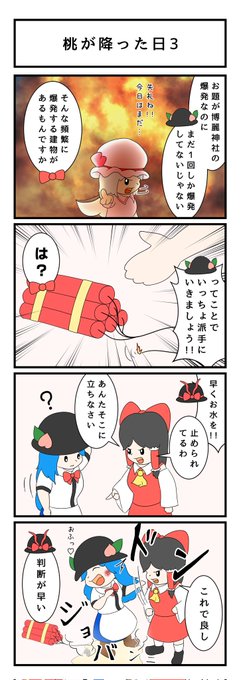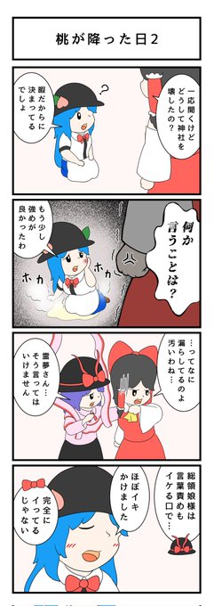 【お題:博麗霊夢、博麗神社の爆発】 神社に手を出せるのは天人様しかいませんね🍑 でも気がついたら、天子が粗相をするお話になっていました…🤔 #博麗霊夢 #比那名居天子 #永江衣玖