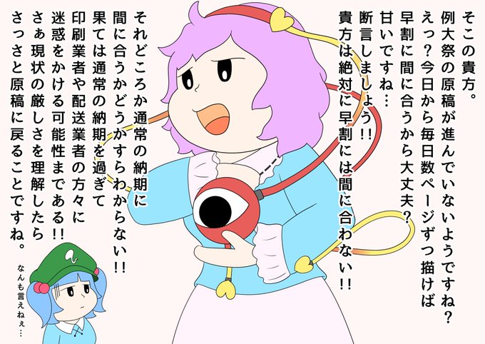 今日は心を読んでアドバイスをしてくれるさとり様のイラストだよ‼️ 早めに忠告してくれるなんて、さとり様は優しいなぁ😊 でも図星すぎるとちょっとつらいね😣💦 #古明地さとり #河城にとり