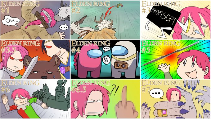 A little collection of all the thumbnails I drew for my Elden Ring playthrough so far (still far from over!)