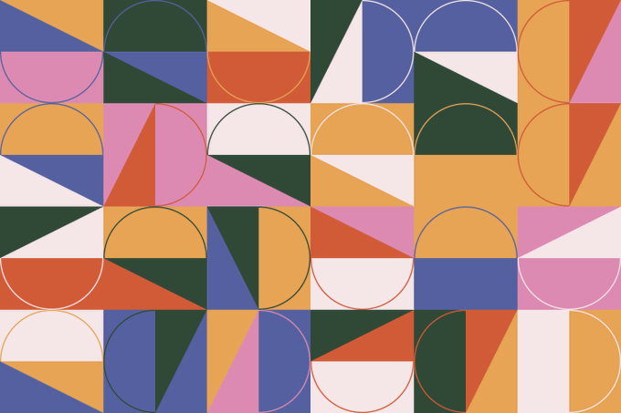 Geometric vector seamless pattern design in Late Modern aesthetics made with simple triangles, semicircles shapes and forms. Horizontal composition.