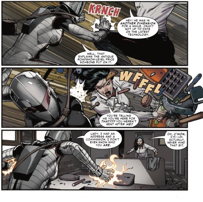 Yoooo @THEKarlaPacheco, #SpiderWoman #13 slaps this week! Review coming Wednesday. Also, the sound effect "WFFFL" made me wonder if a waffle iron was used in Jessica's attack! Gotta love #comics. Also #PerePerez blew my mind with that opening page! Oh baby indeed!