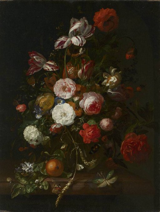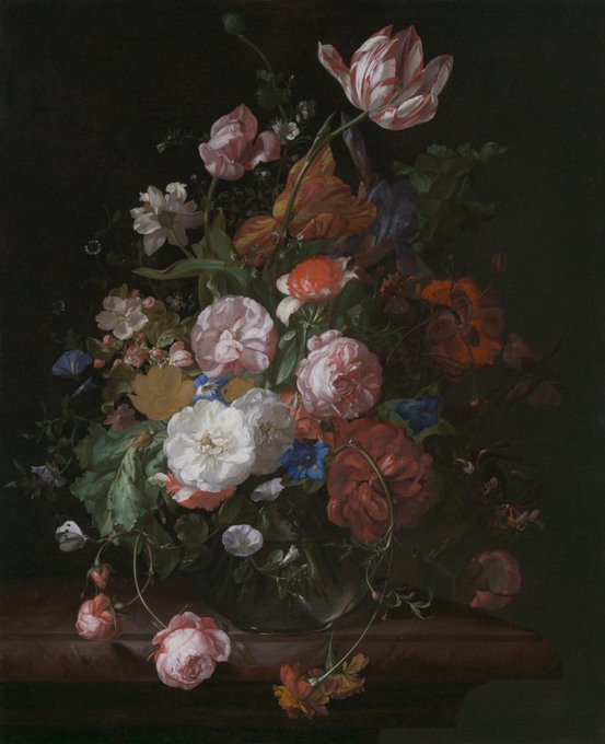 Flowers in a glass vase, with a praying mantis, on a marble ledge, 1708, by #RachelRuysch (Dutch, 1664-1750). Held by Bayerische Staatsgemäldesammlungen, @Pinakotheken, https://t.co/JDwaqWxXXn #artherstory #womenartists