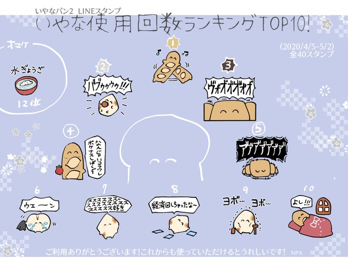 残念ながらLINEスタンプ側の仕様変更で統計情報が全く見れなくなったので1と2リリース時の使用回数ランキングを再掲 #いやなパン