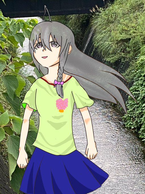 星輝子を人を描く練習がてら描いてみた… 背景描く気力はなかったから家の周りで撮った写真使った差分(?)を3パターン用意しておきました 緑ばっかですねぇ