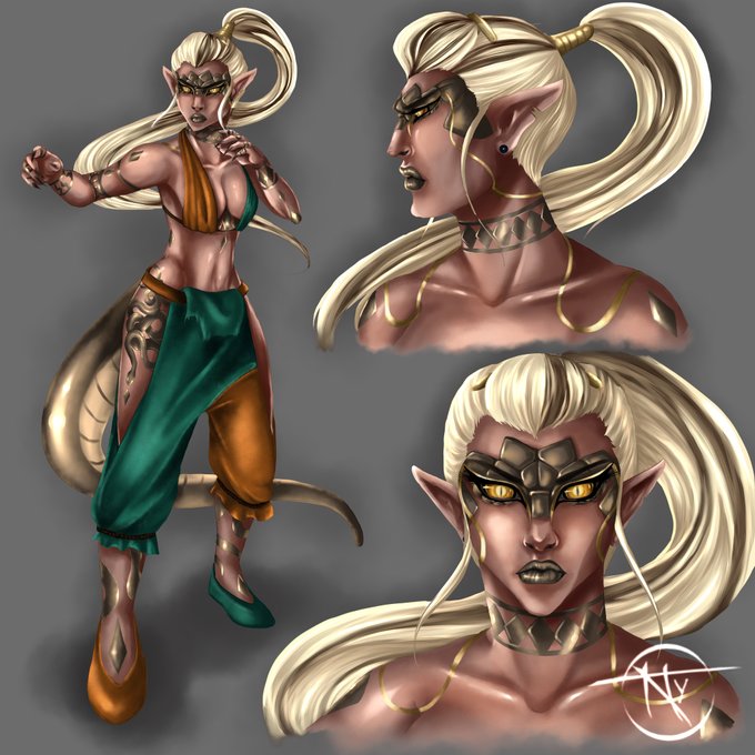 Meet Chara Fer de Lance. She's my version of a Yuan-ti pure blood and she's a monk of the Cobalt Soul.