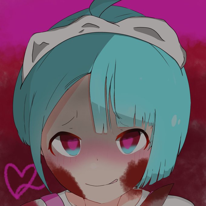 HAPPY HALLOWEEN! 別バージョンもか描いたよ! ヤンデレメイド(コスプレ) インク×ココロちゃん(目 通常ver.) マカロンを食べわったココロちゃん #ヤンデレ #イラスト #マカロン #キラ目 #水色髪