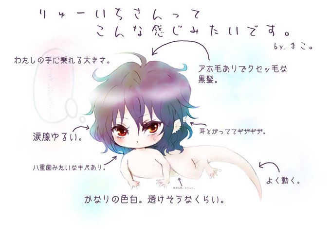 創作。りゅーいちさんといいます。大学院卒で高学歴なのに良い職に就けない腹いせに銀行強盗を繰り返していた人、というか元人。天罰で両生類とも爬虫類とも言えるような体に変えられ、ついでにまこちゃんの手に楽々乗れるサイズにまで縮む。真っ裸。←