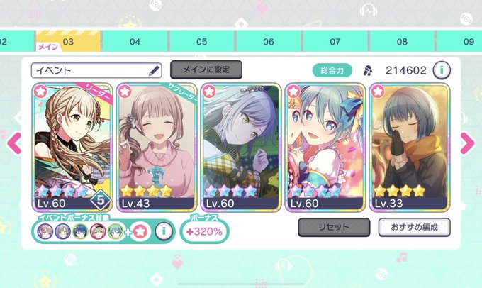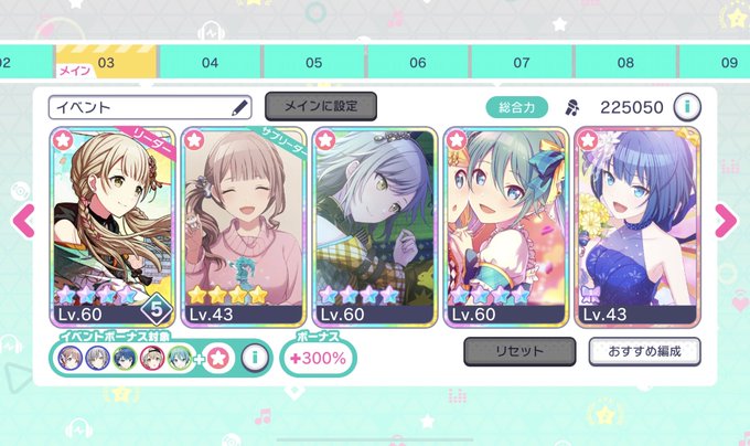 え、単発できちゃあー! なので、編成が3枚目から4枚目に変わりました(サボってたからすぐには育てきれない)