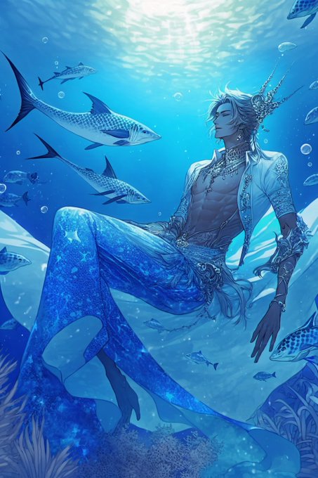 #nijijourney #AIイケメン部 マーマン。同じプロンプトだけど、人物中心になったり魚含めた遠めのカメラになったり脚があって海にさらわれた美青年みたくなったり。にじじゃ先生のイケメン男子ファンタジー力、好きです