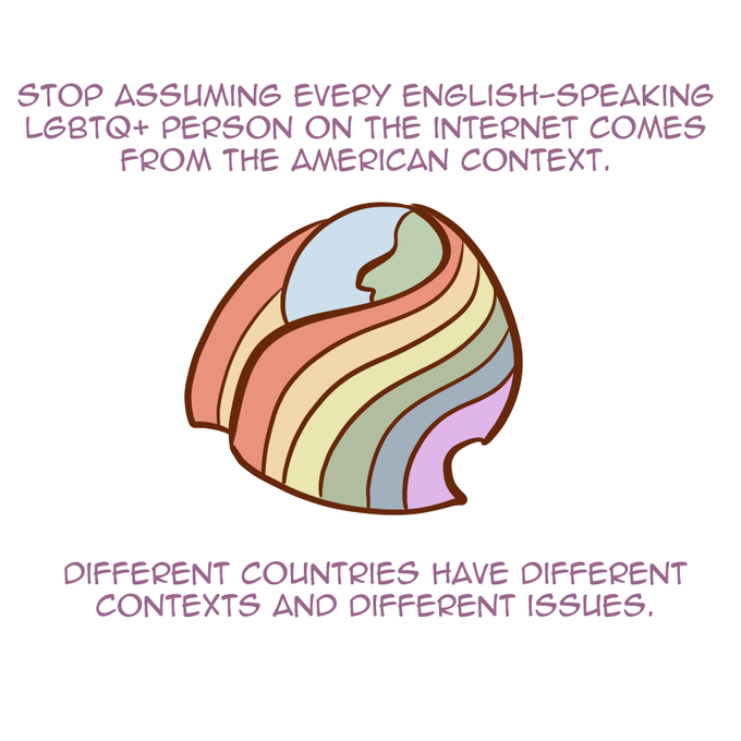 This goes not only to homophobes from the US, but also for the LGBTQ+ people from the US who constantly try to police everyone's labels, speech, beliefs, flags, symbols, etc. based on their country's standards and ignoring the fact that other countries have different contexts.