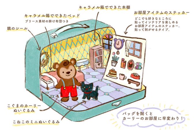 asobizaさんとのコラボプロジェクト第二弾は、持ち運べて遊べるバッグ型絵本。トランクを開くとお部屋に!ぬいぐるみ、絵本、小物シールなど。 受注生産となりクラウドファンディングとしてご支援・ご購入頂ければ大変嬉しいです🌼(2022.3.31(木)~5.31(火)お届け:10月頃) https://t.co/zSEhVPKJsU