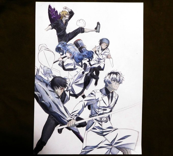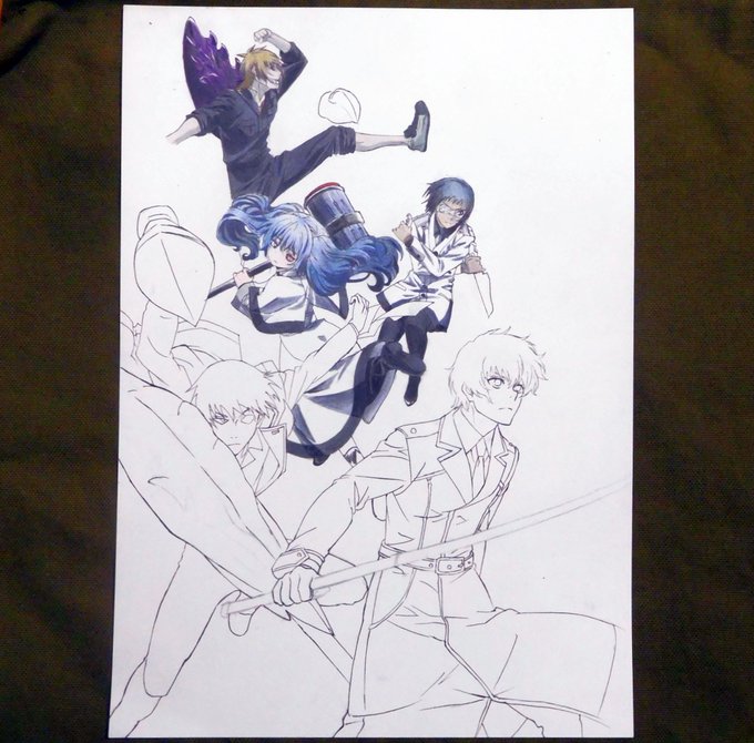 今日の模写動画撮影が終わりました。『東京喰種:re キービジュアル』は琲世が塗れました。服が白いので楽に見えますが影の色のバリエーションが多く、コピックのベースの上から色鉛筆で塗り重ねる色をいろいろ変えて表現しました。キャラ部分はこれで全員完了です。武器と背景もガンバりますo(>`ω´<)o