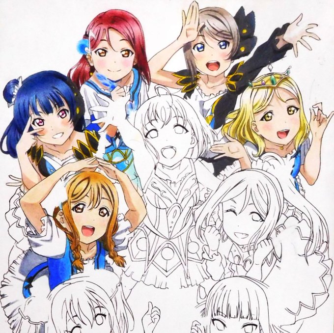 今日の模写動画撮影が終わりました。『Aqours 3rd LoveLive! キービジュアル』は鞠莉ちゃんと花丸ちゃんが塗れました。いつもの如く花丸ちゃんの髪の色は混色の配合が間違いやすいので別の髪で試してから塗りました。また青い衣装がムラになりやすいのでムラなく塗るのに手間がかかりました٩( 'ω' )و