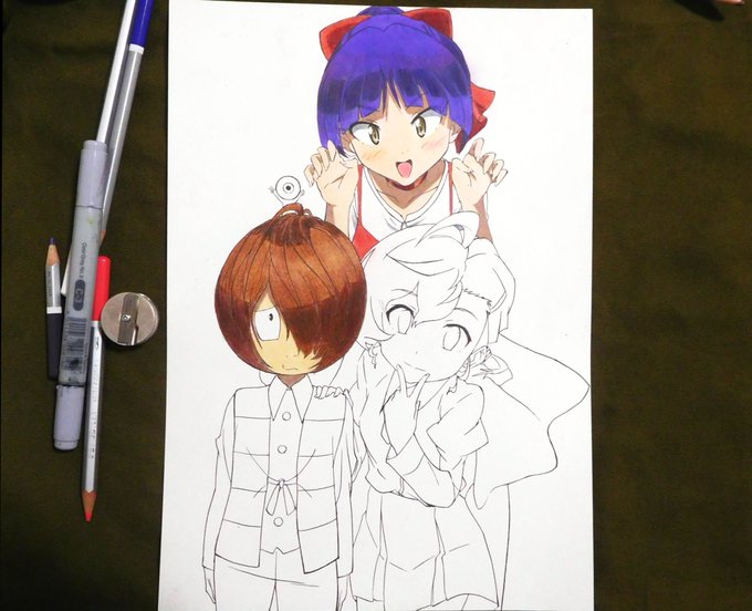 今日の模写動画撮影が終わりました。『ゲゲゲの鬼太郎』はネコ娘の上半身が完成し鬼太郎の髪と顔が塗れました。手持ちに鬼太郎の髪の色に合うコピックが無かったので全面色鉛筆で塗りましたが重ね塗りで色のムラを無くすのに苦労しました。薄い箇所から塗ると時間ロスが大きいのが反省点です٩( 'ω' )و