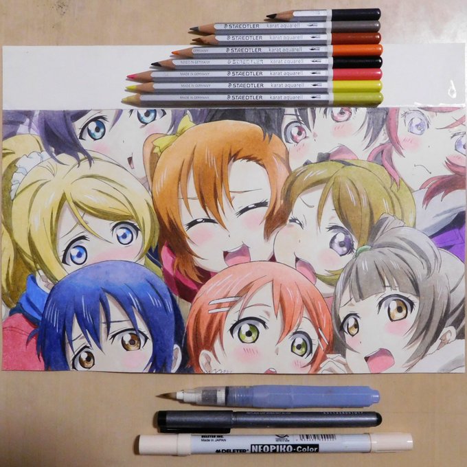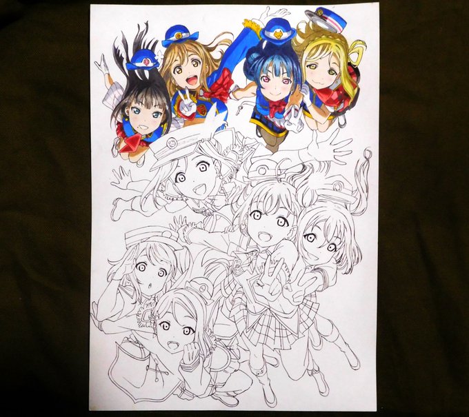 今日の模写動画撮影が終わりました。『Aqours 2nd LoveLive! キービジュアル』の彩色続きです。本日は右上のヨハネとマリーが塗れました。意外と衣装の赤がムラになりやすく手間がかかりました。これから先、下にいる大きなキャラを塗る時に面倒な予感がします((((;゚Д゚))))ガクガクブルブル