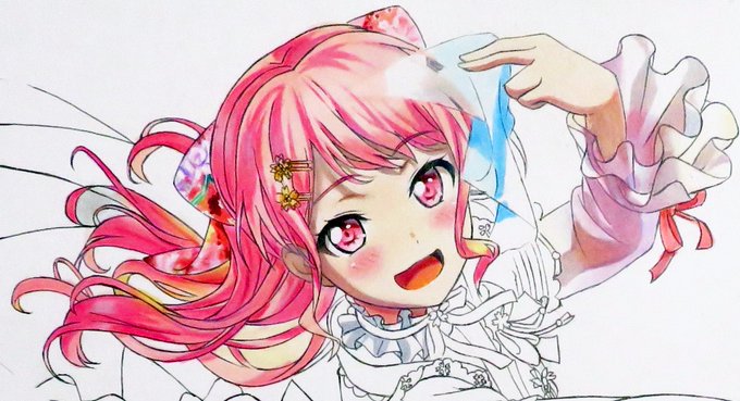 今日の模写動画の撮影が終わりました。『バンドリ! ガルパ 丸山彩 これで完璧!』は彩の顔と髪と左手が塗れました。自宅の環境由来ですがコピックのピンク系をスキャンすると色が変わるので、色鉛筆で塗り直す事がよくありました。この絵はピンク系が広範囲なので最初から色鉛筆で塗りました٩( 'ω' )و