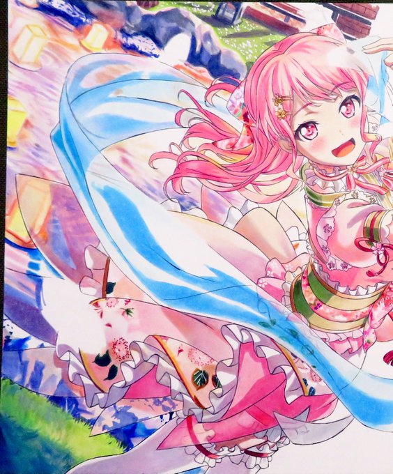 今日の模写動画の撮影が終わりました。『バンドリ! ガルパ 丸山彩 これで完璧!』は今日から背景に投入です。左半分が描けました。背景も全体にピンク系が入っているのでコピックで下地を作ってから色鉛筆を重ねています。羽衣の水色を意識して透ける部分の色を変える事で透明感につなげます٩( 'ω' )و