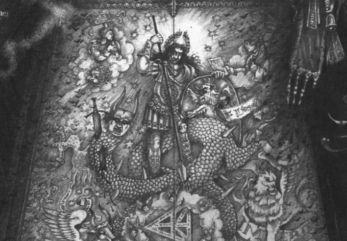 ←)40kの9版の予告ムービー、シスターが祈りを捧げたステンドグラス →)帝殿の《永劫の門》 皇帝が邪悪なドラゴンを征伐する図像。盾を手に首に剣を突き刺し、槍を手にしている同一の図像。 皇帝=帝国が竜=敵と相対する図像を用いたという事は、つまり今の敵と関係があって… 相手はネクロンで…