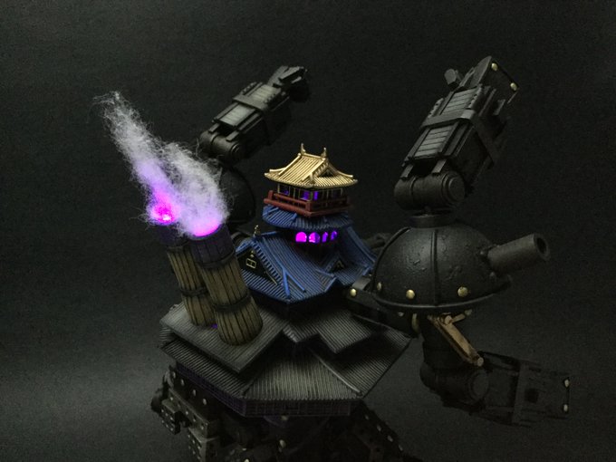 LEDを使用してネザーの力を発動させて天守が光り、煙を上げている状態の再現。ここはメタルマックスゼノリボーンのアイアンベースのイメージから。