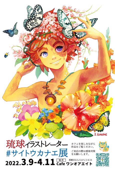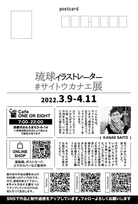 水曜日からの #サイトウカナエ展 DM設置→Cafe ONE OR EIGHT、県博(おきみゅー)、大城画廊に置かせていただいています。 「配ったり、置いたりしてあげるよ」という優しい方🙏10枚~郵送しますのでメッセージくださいませ。