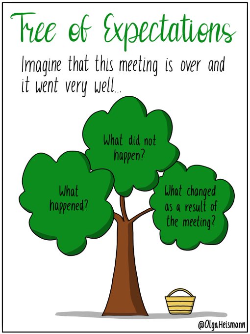 This format can be used in the beginning of a meeting. Each participant can put sticky notes in the three areas of the tree. At the end of the meeting, the sticky notes can be revisited and those that came true can be moved to the basket next to the tree. #sketchnote