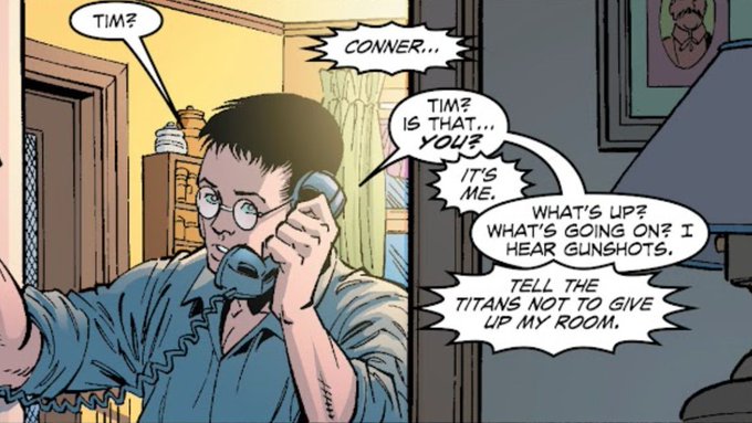 Tim Drake had the best return. Had Superboy on the line while Gotham City was sounding like Gran Theft Auto in the background and told him, "TELL THE TEEN TITANS THE BOY WONDER BACK! PUT THE WORD OUT THAT WE UP."