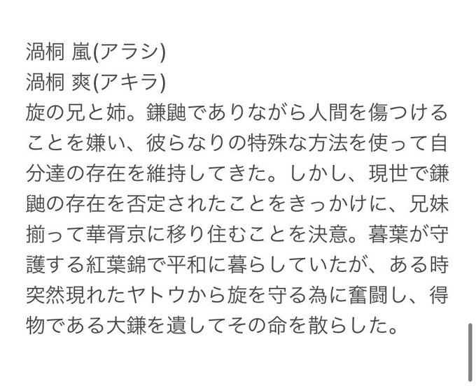 #華胥の京より愛を込めて 旋ちゃんの兄と姉(立ち絵はありません) 鎌鼬は三匹で行動するという説話を元に考えました。旋ちゃんが持っている大鎌はこの二人の形見です