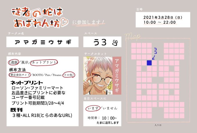 頒布物はネップリ+既刊です ネップリは眼鏡ジャミカリのイラストになります ユーザー番号はWebオンリー会場のみでの記載になるためスクショや画像保存をお願いします よろしくお願いします🐰 #のれん0328 #のれん参加表明