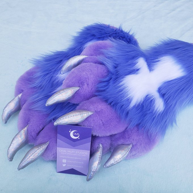 Its been a minute since I made some pastel goth paws. these paws have lavender and periwinkle luxury shag, tie dyed shiny paw pads, holo silver claws and some crosses on the backs👀 Commissioned by a user on IG. (pattern is by Kloofsuits on Etsy)