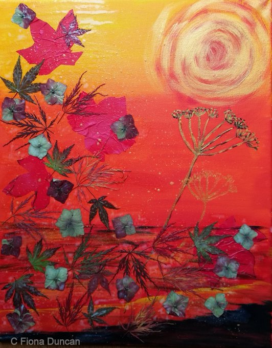 @ICCollabCreate Hi @ICCollabCreate This is a mixed media piece I did called Autumn Magic. An acrylic background with acrylic ink and tissue leaves. I then pressed and dried hydrangea bracts and acer leaves glued them on, great fun to do.